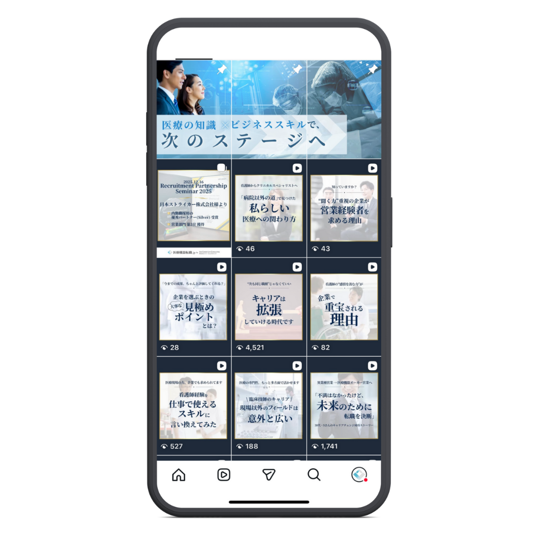 医療機器業界への転職支援を行う会社において、求職者との接点を増やすためInstagram運用を開始しました。 これまで紹介や求人媒体を中心に集客を行っていましたが、若手層や情報収集段階の求職者との接点が十分ではないことが課題でした。 特に、25歳から35歳の医療従事者や営業経験者は、転職を具体的に考える前からSNSで情報収集を行う傾向があります。 その段階で接点を持ち、信頼関係を築くための媒体としてInstagramを導入しました。 単なる求人告知ではなく、「業界理解を深められるアカウント」としてのポジション確立を目的とした運用です。